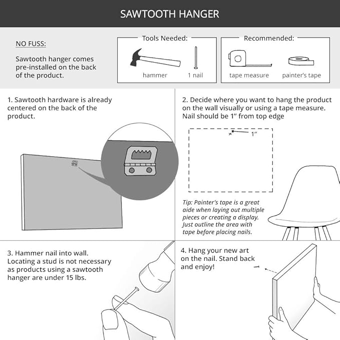 - READY TO HANG: Your canvas comes with pre-installed hanging hardware already attached to the back of the product. Once the item arrives, all you need to do is hang it on a nail. We also include instructions for measuring and hanging with your product to make the process as easy as possible. We strongly recommend using a nail, rather then adhesive tape or tabs.