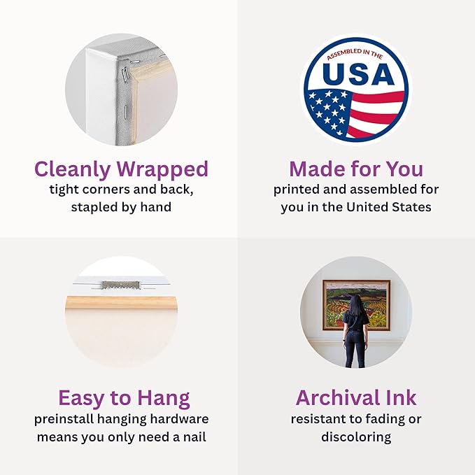 - HANDCRAFTED WITH CARE: Our items are printed and assembled in the United States of America! Each of our wrapped canvas prints are stretched and stapled by highly-skilled craftspeople, ensuring that the canvas is pulled tight and has clean, professional corners. Once completed, our frame professsional fits your canvas with a float frame for the polished, modern look. We pride our items' outstanding longevity, quality, and durability, and art proud to manufacture in the USA.