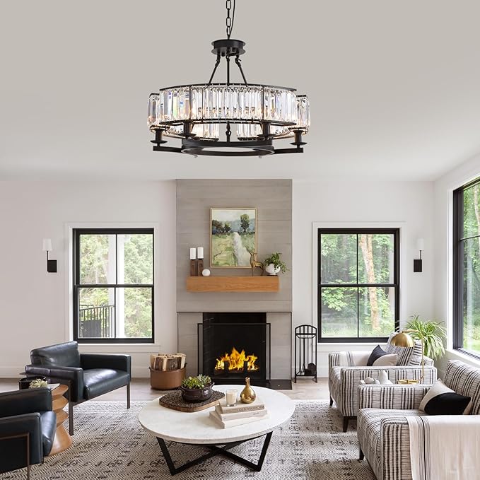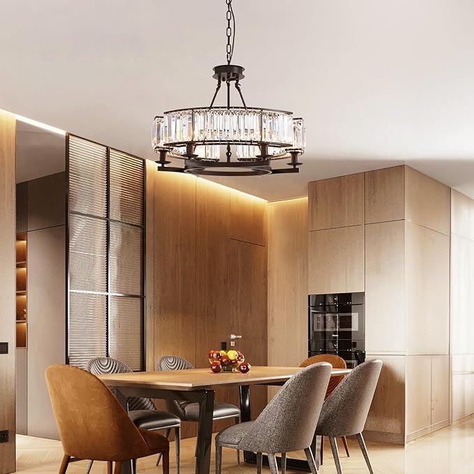 - 6 Lights Round Crystal Chandelier: This exquisite fixture features a sleek round design with a touch of black farmhouse style, adding an industrial flair to your space.