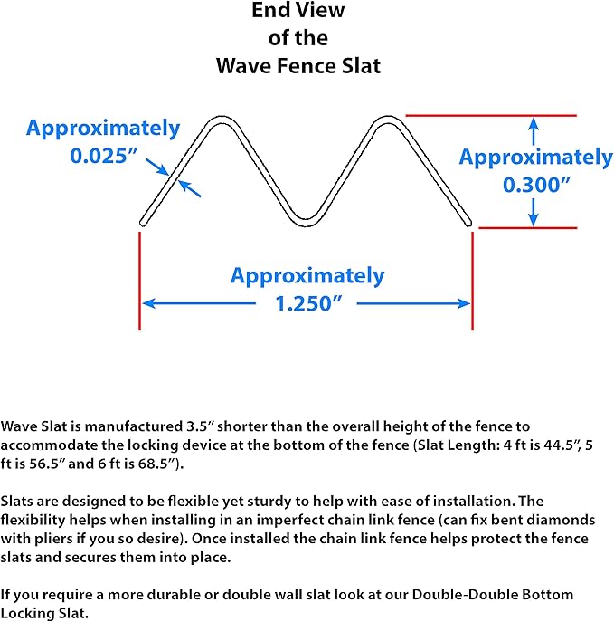 - Designed for 2" to 2.375" diamond and 9, 10, 11, 11.5 gauge wire. Slat width is approximately 1.25”. A 2" diamond will provide approximately 85% privacy, a 2-1/4” diamond will provide approximately 80% privacy and a 2-3/8” diamond will provide approximately 75% privacy (a larger diamond will have less privacy and a smaller diamond size will provide better privacy). Make sure you measure your chain link fence diamond before placing an order.