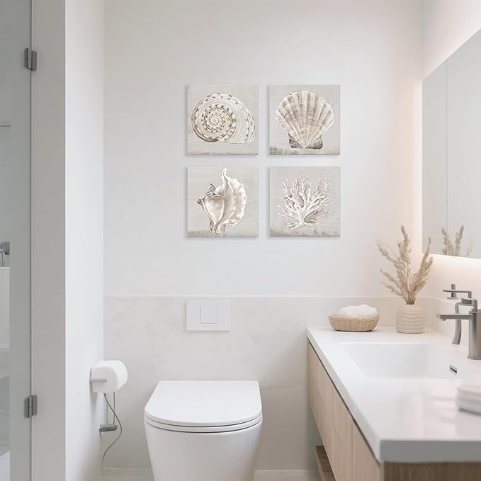 JAPO ART White Sea Shells Pictures Coastal Beach Canvas Wall Art Picture Vintage Seashell Giclee Print on Canvas Stretched for Living Room Bedroom Wall (White shells Eva Watts, 12x12Inchx4pcs)