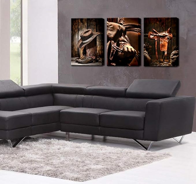Biuteawal - 3 Pieces Canvas Prints American West Rodeo Cowboy Wall Art Painting Brown Straw Hat on Leather Rancher Roper Boots Picture on Canvas Vintage Artwork Stretched for Home Office Decoration