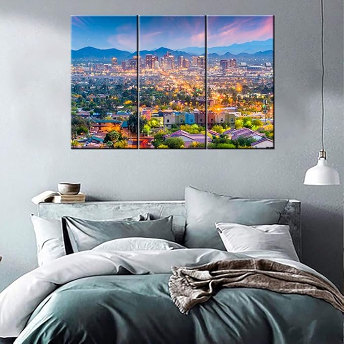 - 3 Pieces Modern Canvas Painting Wall Art the Picture for Home Decoration Panoramic View of Phoenix, Arizona, USA downtown Cityscape at Dusk Print On Canvas Giclee Artwork for Wall Decor - 28x42inch