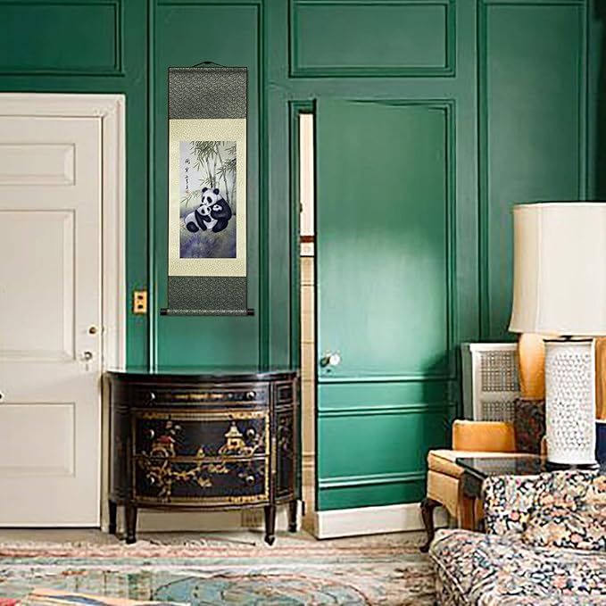 AtfArt Asian Wall Decor Beautiful Silk Scroll Painting Chinese Panda National Treasure Oriental Decor Chinese Art Wall Scroll Wall Hanging Painting Scroll (36.2 x 12 in)