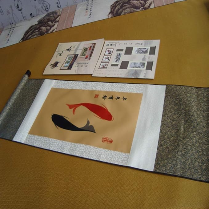 AtfArt Asian Wall Decor Beautiful Silk Scroll Painting - Ancient Pisces Double Fish Oriental Chinese Art Wall Hanging (39 x 12 in)