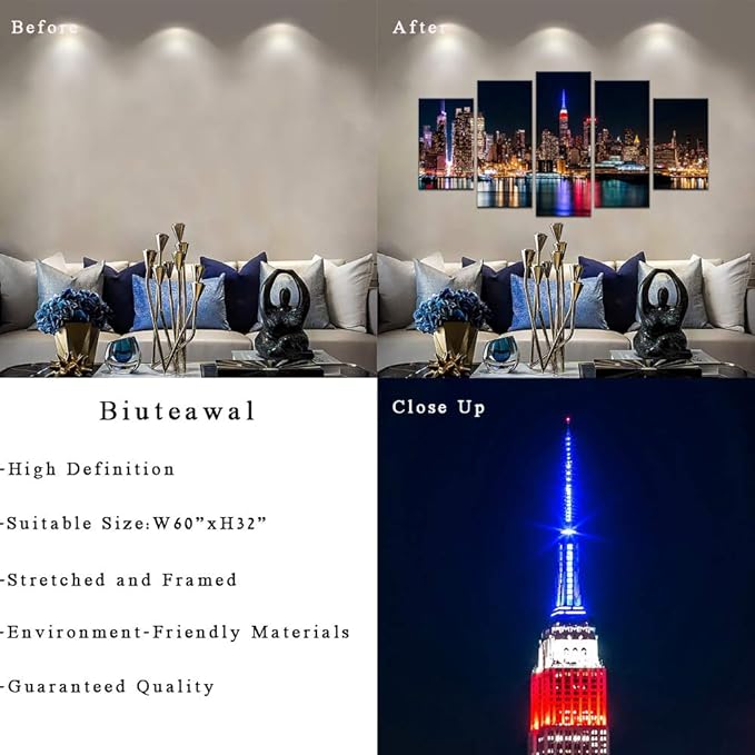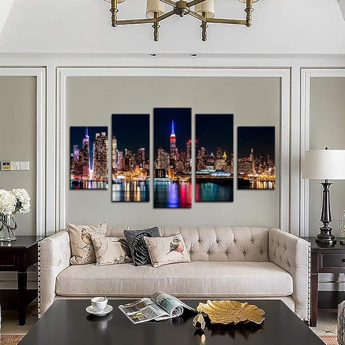 Biuteawal Large 5 Piece New York City Canvas Wall Art Manhattan Skyline at Night Picture Prints Modern Home Office Wall Decoration Gallery Wrapped Ready to Hang