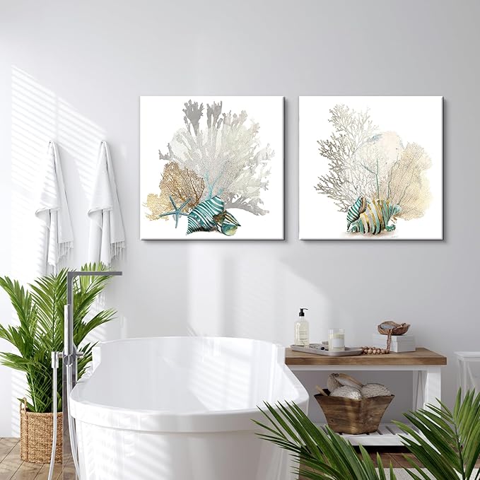 JAPO ART White Coral Wall Art Beach Bathroom Decor Sea Shell Pictures Coastal Wall Decor Sea Fan Nautical Painting Ocean wall art for Livingroom Bedroom Home Walls 20x20Inchx2pcs