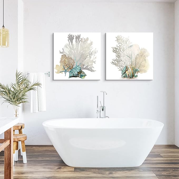 JAPO ART White Coral Wall Art Coastal Wall Decor Beach Bathroom Decor Sea Shell Pictures Sea Fan Nautical Painting Ocean Wall Art for Livingroom Bedroom Home Walls 12x12Inchx2pcs