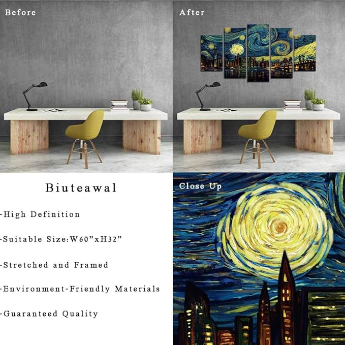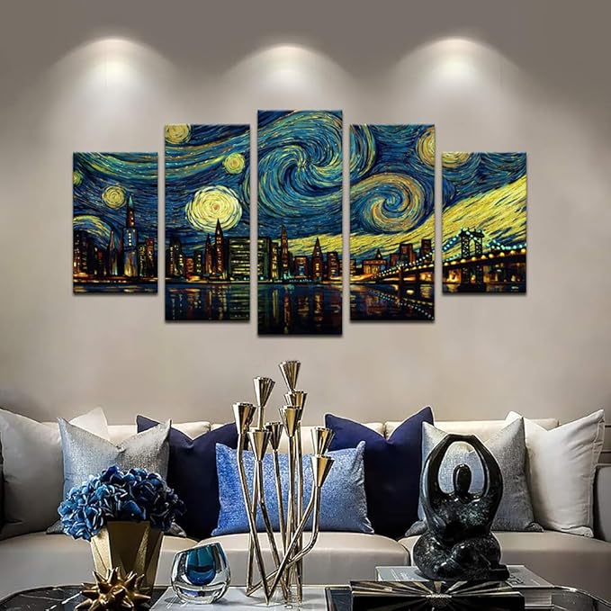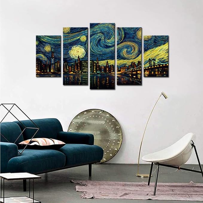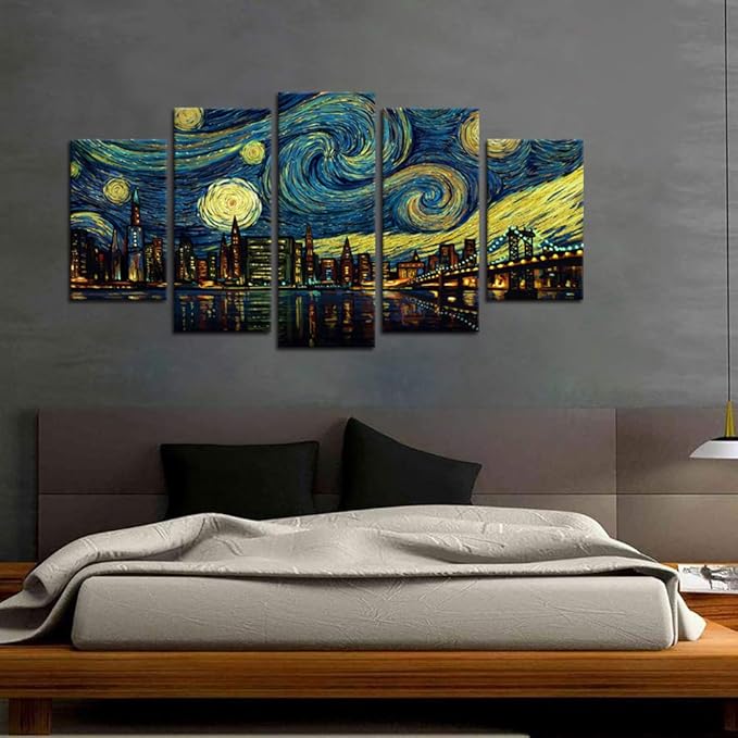 Biuteawal 5 Piece New York City Canvas Wall Art Manhattan Starry Night Skyline Painting Print on Canvas Modern Home Office Living Room Wall Decoration Gallery Wrapped 60x32inch