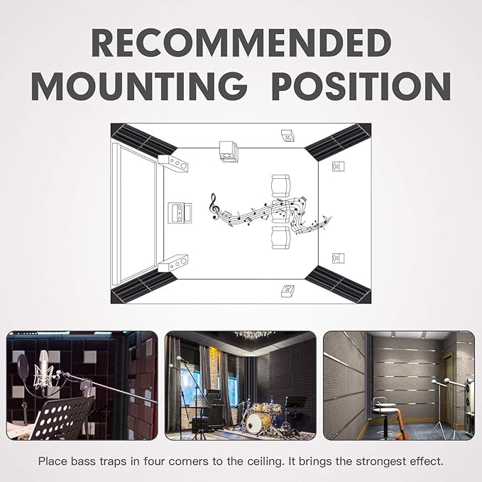 - Size and Color- Package includes 8 pack of 8’’x8’’x12’’ black bass traps corner foam.Generally speaking, Mounting the bass traps from the bottom to ceiling of the corner brings the awesome acoustic performance. Or mount 3 pack bass traps in one corner of ceiling.