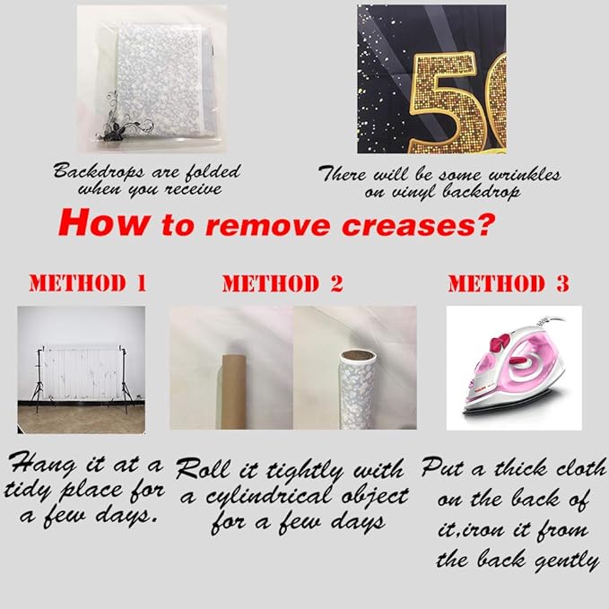 - 【 Warm tips】: Backdrop will be sent by folded.Roll it tightly with a cylindrical object to remove crease.If necessary, Iron it from the back like iron your thin clothes.All photography backdrops can be customizable, different sizes, adding letters.