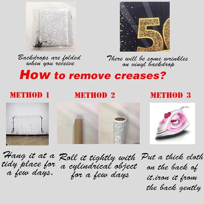 - 【 Warm tips】: Backdrop will be sent by folded.Roll it tightly with a cylindrical object to remove crease.If necessary, Iron it from the back like iron your thin clothes.All photography backdrops can be customizable, different sizes, adding letters.
