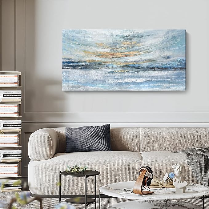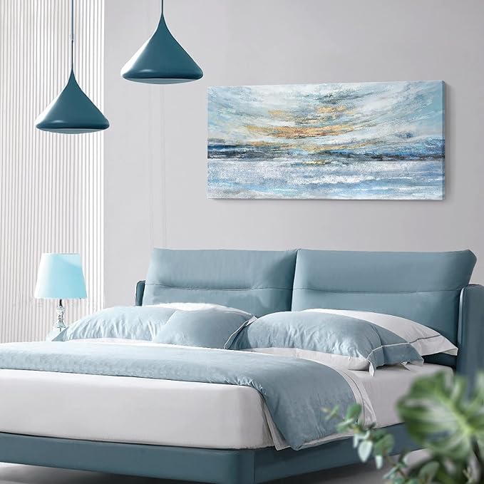 - ★Abstract coastal sunrise landscape. Serene shades of light blue seem to take on the depth, calm colors and relaxed feel of the sunrise / sunset at the coast in abstract form. Bringing a touch of tranquility to your space is a breeze with this abstract wall art print.