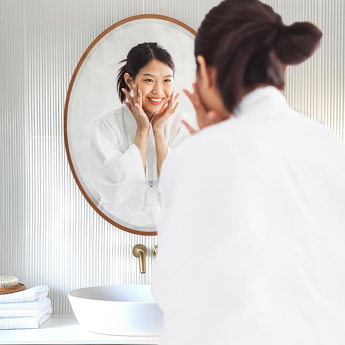 - ½” wide oval wood frame with a front-mounted mirror that appears to float. 1" beveled distortion-free mirror for added depth and clarity