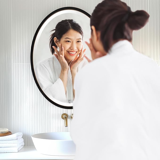 - ½” wide oval wood frame with a front-mounted mirror that appears to float. 1" beveled distortion-free mirror for added depth and clarity