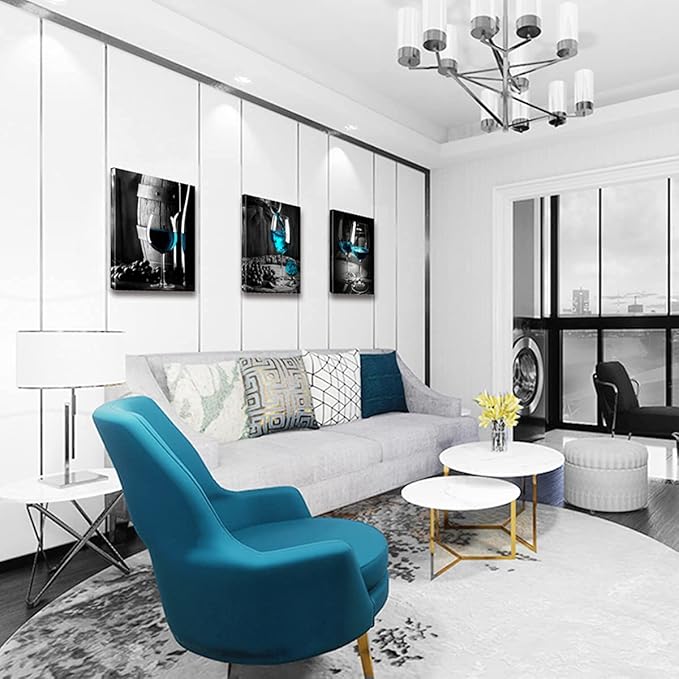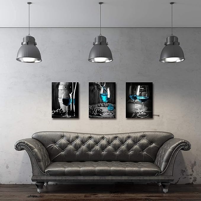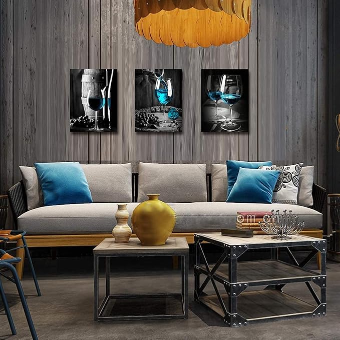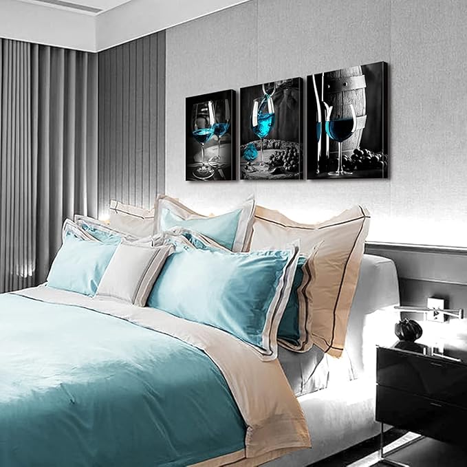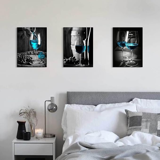 - 🍷Color: black, white,teal blue. Wine decor wall art brings out a strong connection to daily with its varying shades of blue,black and white. Adds a splash of style with has a strong sense texture and artistic sense blends well with most home decor.
