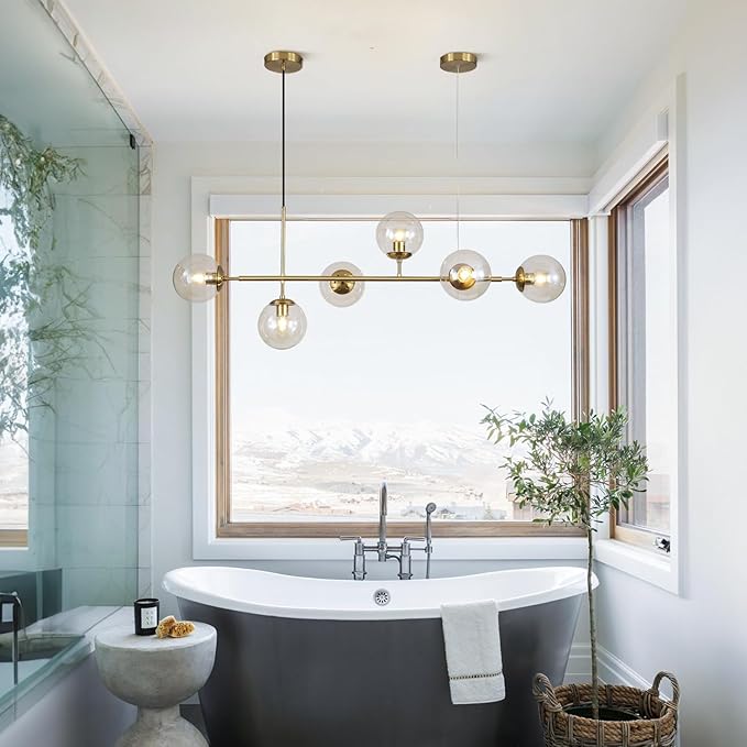 - Creative Design: The gold and glass island lights for kitchen island features six amber glass shade and a long metal frame, which is characterized with a modern flair. The amber glass shade diffuse the light to create a welcoming glow, adding a retro modern accent and ample illumination