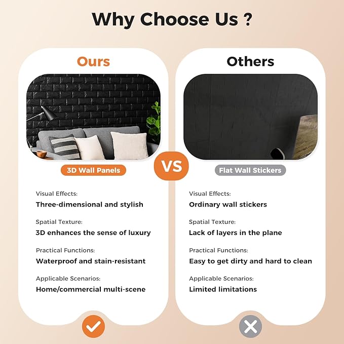 - No Damage to Wall for Removal: This black brick 3d foam wall panels is easily removed without damaging,and no glue left. But please remember that you need to tear the waterproof sellf-adhesive 3D wall panels off slowly.