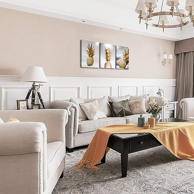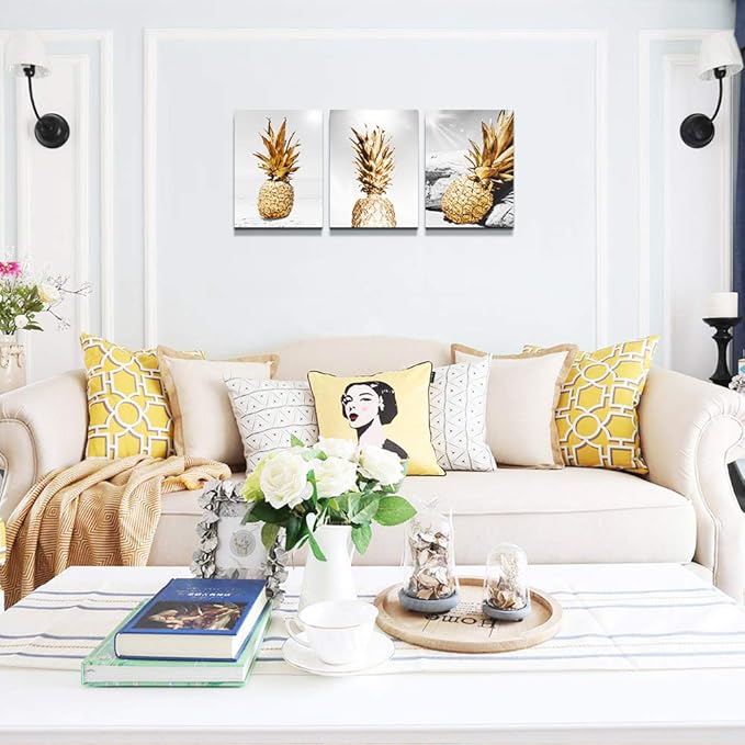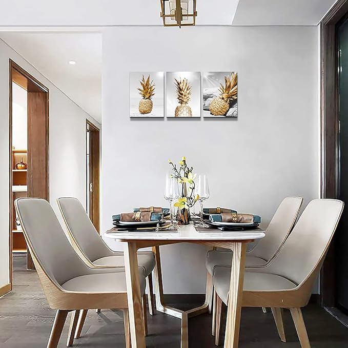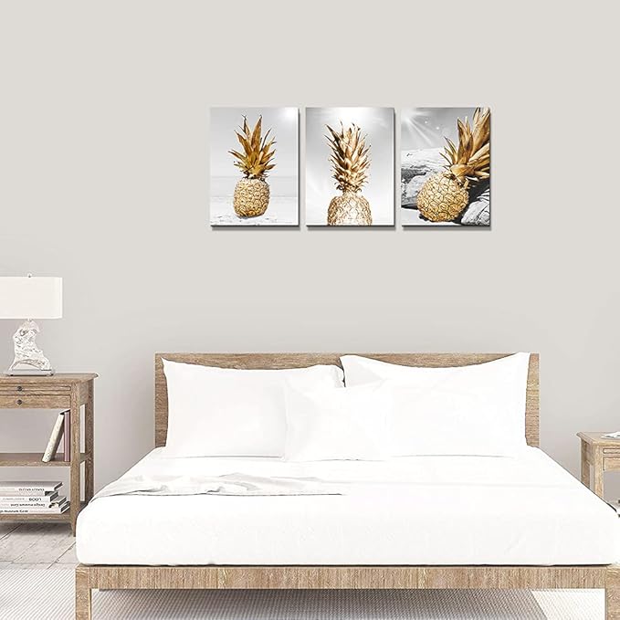 Canvas Wall Art For Bar Kitchen Living Room Office Bathroom Home Decoration Board Black And White Beach Scenery Golden Pineapple Pictures Artwork Restaurant Wall Decor Ready To Hang 20x28inch 3 Piece