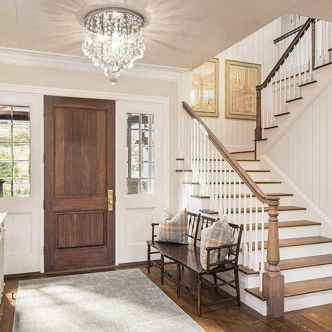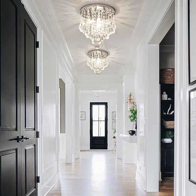 - 💡Close To Ceilng Light Design: Silver chrome plate,Sparkling Crystal Chandeliers Light clear and twinkling,and refract some subtle colors. When the fixture is illuminated,add an elegant touch to your home.【Recommended Room Size】:53-107 square feet
