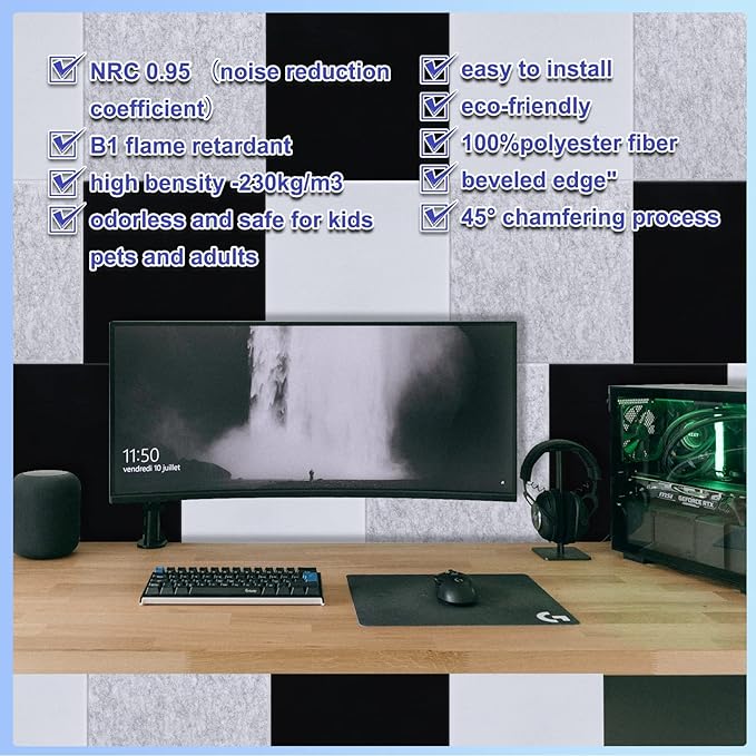 - [Material Safety] The sound proof foam panels is made of polyester fiber, which has better ductility and wear resistance, is not easy to be deformed and damaged, and has a long service life,non-toxic, non-irritating odor, safe to breathe and touch. The acoustic panel adopts large size, high density, and weighs only 0.3lb. It covers a larger area and has a more obvious noise reduction effect.