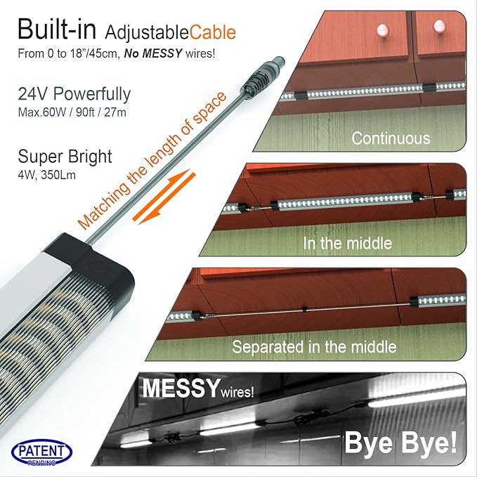 - 【Built-in Adjustable Cable & External Cable 】 LED under cabinet light Bar Built-in 0 to 45cm / 18" Adjustable Transparent Cable, 2 Pcs 120cm / 48" External Cable, you can Adjust the Cable Length at will, Safe 24V power supply Without Voltage Drop, Maximum connection to 10m / 30ft, more Uniform Brightness, 12W 1050 Lm Equivalent 75W Lamp, Energy Saving, Save Money and Environmental Protection!