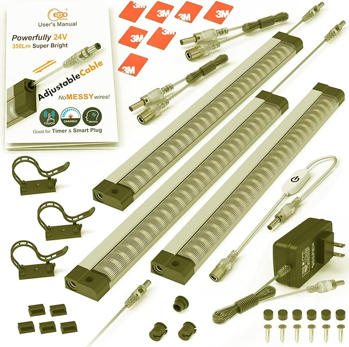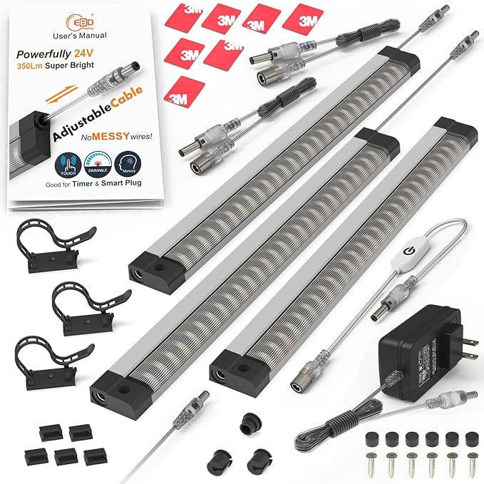 - 【WHAT YOU GET】This LED closet lights Kit includes ETL Listed Adapter, Touch Dimmer, 3 Pcs 12inch Light Bar, Built-in adjustable cable, 2 Pcs 1.2m / 48" Transparent Cable and Full set of installation accessories, We offer 6-month money-back guarantee and a 12-month Worry-Free Warranty ( Can be extended to 24-Month ). If there is any problem, we will respond and solve it within 24 hours Program.