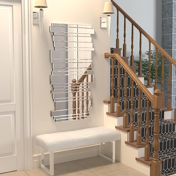 - SPECTACULAR DESIGN:Some glass strips of different sizes interlock with each other to form this very distinctive wall mirror. The smooth edges of strips are hand polished to ensure safety