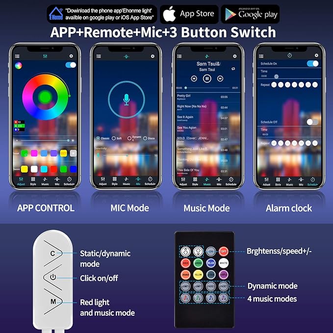 - 【Multiple Mode to Control Your Lights】Control the LED strip lights via(APP+ IR Remote+Mic+4 buttons ) ①APP Control:Scan the QR code in manual to Download the app"Ehome Light"( Google Play and iOS App Store) Adjust brightness, change colors.②Music and Mic Functions :Built-in mic, lights will pulsate and change colors along with the environmental sound and music③IR Remote:20-key 4 music mode to control the light strip④4-button controller:Through 4 keys switch between static, dynamic,and MIC mode.