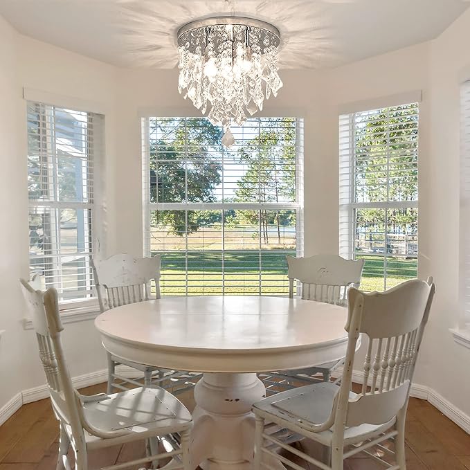 - EXQUISITE DESIGN-The 3-lights flush mount crystal chandelier is composed of strings of maple-leaf crystal prisms and beads and chrome canopy,with an elegant and compact shape.The chandelier light crystals are authentic K9 crystals,transparent and shiny,reflecting pretty light shadow on the ceiling.