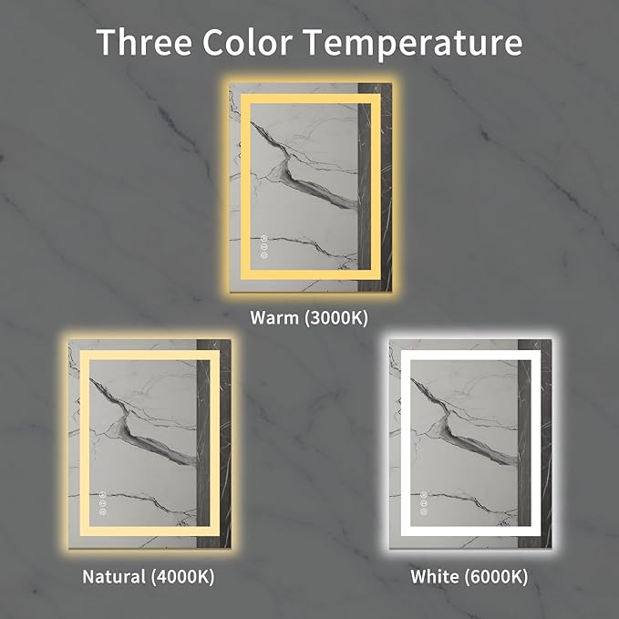- 【Dimmable & 3 Color Temperature】: The brightness is adjustable for the lighted bathroom mirror; Simply long press the touch switch to adjust the brightness; 3 color temperature for option; warm light (3000 K); natural light (4000 K); white light (6000 K)