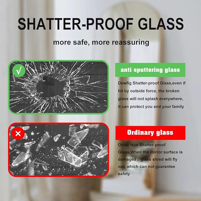 - SHATTPROOF GLASS - The High-definition float mirror with 1:1 glass shows ture reflection, don’t worry it will lengthen or distort images,Even damaged by external force,it will protect you from shattered splashing and hurting your body.