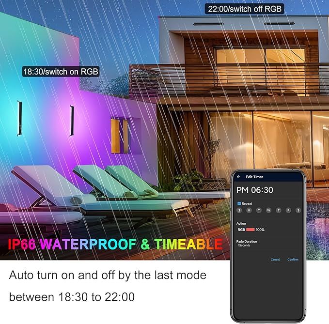 - 【Timing Function & Group Control】Not just Turn ON/OFF! Our APP provides more detailed timer setting. You can set the rgbcw wash light bar turn on or turn off at a specific time, or turn on a certain mode automatically. With the Bluetooth Mesh group-control technology, you could control multiple rgb flood lights as group at the same time or control them individually. Just one click, your garden, backyard, pergola, stage will be colorful and charming with these smart led floodlights.