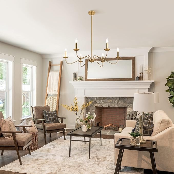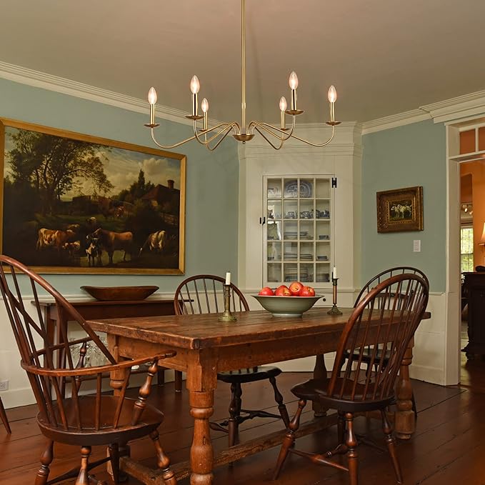 - Modern Chandelier: The dining room light fixture is brushed gold finish, features 6 candle-shaped stems placed on simply curved iron arms. Timeless and elegant design. Suitable for any interior style: classic, modern farmhouse