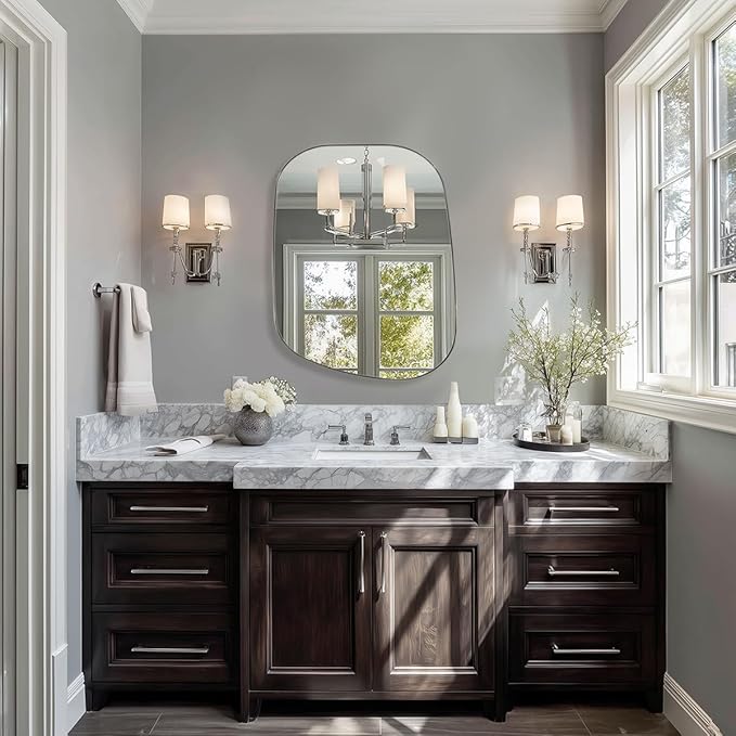 - Easy-Hang & Safe Delivery: ANDY STAR unique bathroom mirror features triple-layer protection—PE bag, poly foam, and sturdy master box—to ensure secure delivery. The asymmetrical mirror includes four reinforced D-ring hanging clips, enabling straightforward horizontal or vertical installation with included hardware