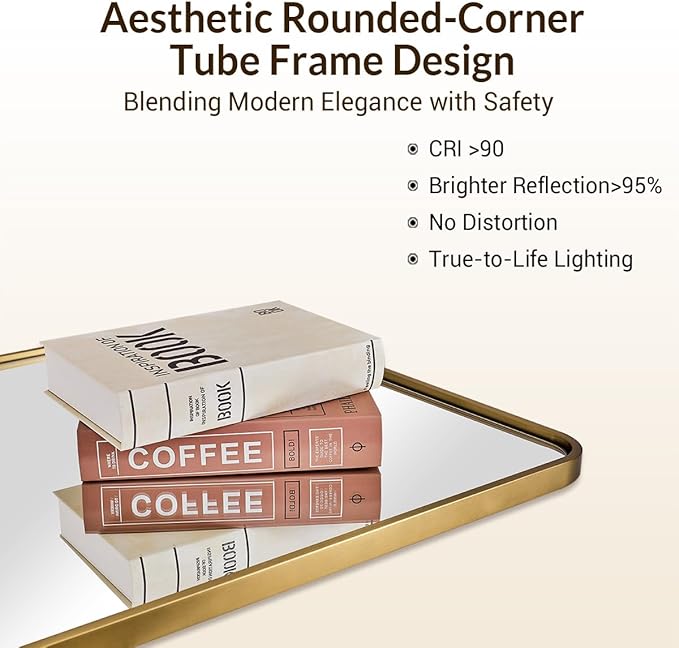 - 22x30 Brass Bathroom Mirror Ideal for Home: This 22x30 rounded gold mirror is the ideal medium size for your space. With our unique beauty rounded frame design, it could definitely be the one for your space. The tube metal frame design with sophistication brass finish could match any decoration style. Let this gold bathroom mirror add the light and enhance the beauty in your home instantly