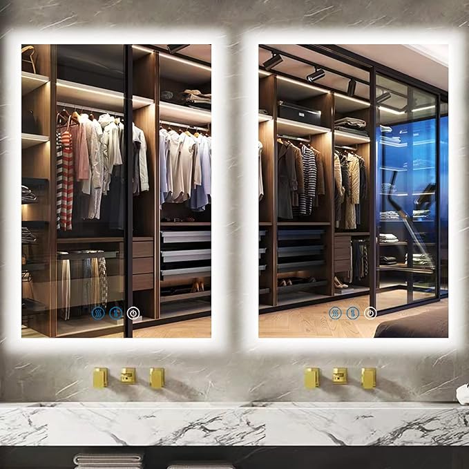 - đăAdjustable Brightness & 3 ColorsăThis bathroom LED mirror light is dimmable, the button will be blue in a dark environment. Simply touch the round button for 3 seconds to change brightness. Meet your habits with 3 colors light, warm light /day light /cold light that will give you a strong light for personal care or a gentle light as a ambient light. The anti-fog is separately controlled by a button, turn on/off, it is the high quality life choice with no more foggy mirrors.