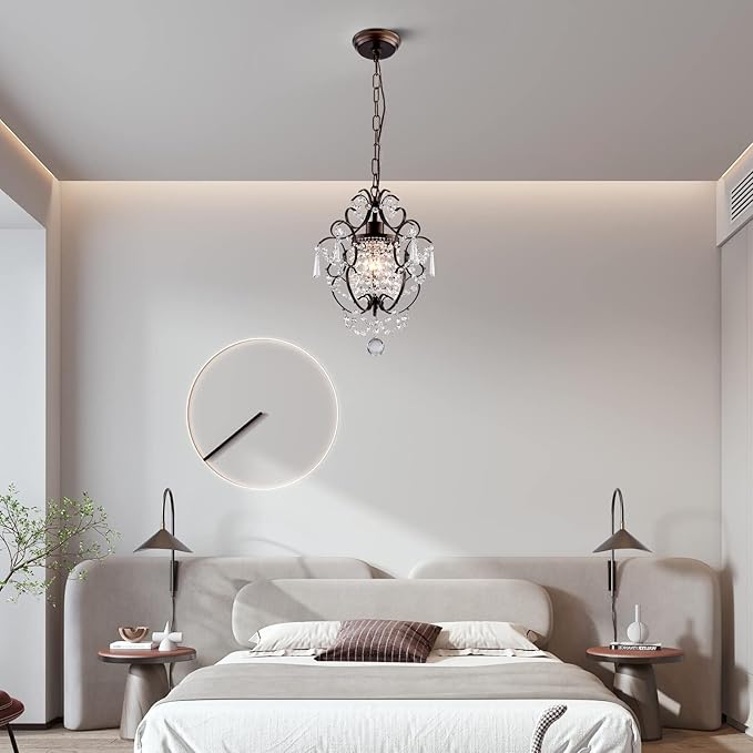 Modern Mini Crystal Chandelier,Iron Bronze Crystal Light Fixtures Ceiling Mount 1 Light Small Chandeliers for Bedroom Elegant Hanging Lighting for Girls Room Dining Room Closet Kitchen Island