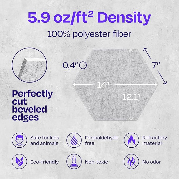 - 【SUPERIOR NOISE REDUCTION PANELS】: Each soundproofing panel is precisely cut of high-density, 5.9oz/ft^2 (1800gr/m^2) poly-fiber panels. Our sound proofing padding for wall reach a NRC rating of up to 0.95, making a big difference to the sounds we hear around us. Pick these hexagon acoustic panels over the old acoustic foam panels and create a beautiful room with superior sound quality.