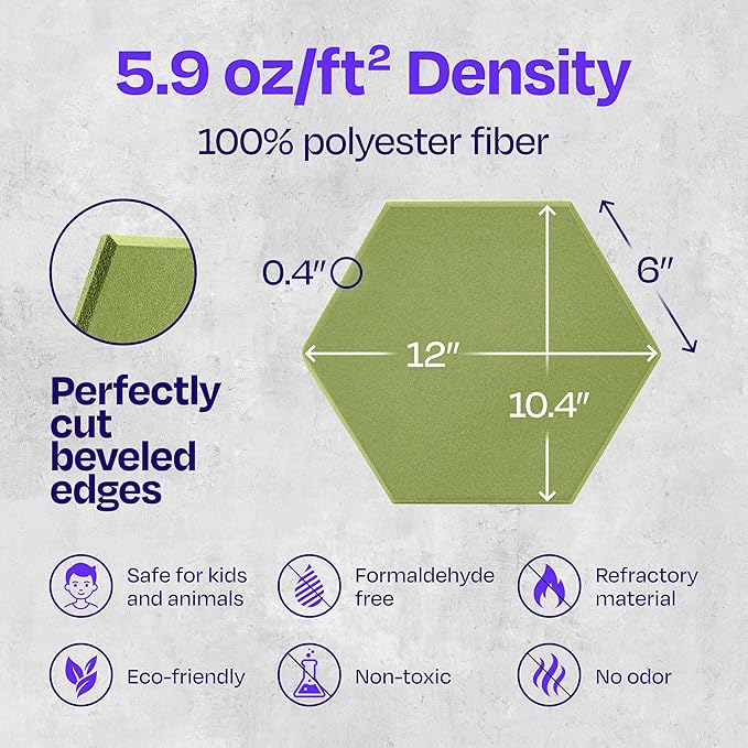 - 【SUPERIOR NOISE REDUCTION PANELS】: Each soundproofing panel is precisely cut of high-density, 5.9oz/ft^2 (1800gr/m^2) poly-fiber panels. Our sound proofing padding for wall reach a NRC rating of up to 0.95, making a big difference to the sounds we hear around us. Pick these hexagon acoustic panels over the old acoustic foam panels and create a beautiful room with superior sound quality.