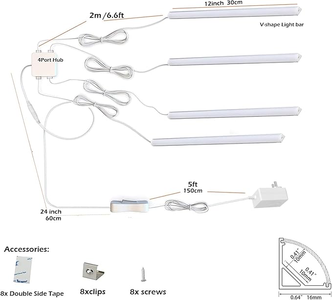 - V Shape Design: Designed with V shape and an elegant aluminum extrusion profile, our light bars are perfect for corner installation, offering a low-profile and stylish lighting solution. Easily create a stylish atmosphere in your kitchen cabinet, showcase, closet, or shelf.
