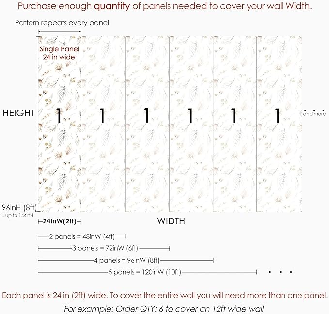 - FIT ANY SIZE: Our wallpapers are sold by the panel, and all panels of wallpaper are custom printed. Each panel is 24" inches wide with an additional 3/4" for an overlap. Select the HEIGHT option and panel QUANTITY based on your project WIDTH and HEIGHT measurements.