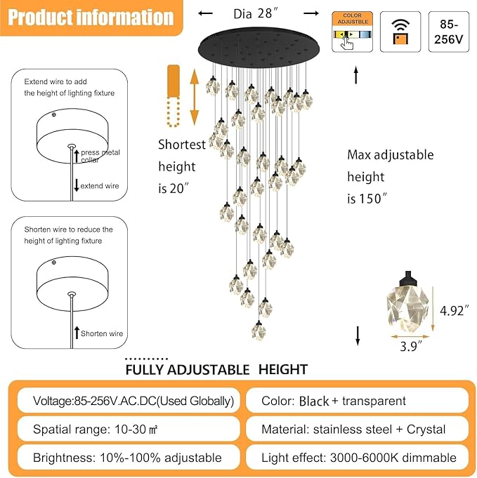 - ✨【Modern led crystal chandelier size】 L28'' X W28'' X H150''. Pendant cord is adjustable. The whole lamp is 150''(12.5feet )tallest. The shortest height is 30. wide and the voltage can be anywhere AC85-256V.