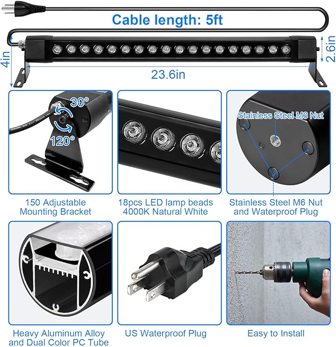 - ๐กใ๐ ๐๐ฌ๐ญ ๐๐ง๐ ๐๐ข๐ฆ๐ฉ๐ฅ๐ ๐๐ง๐ฌ๐ญ๐๐ฅ๐ฅ๐๐ญ๐ข๐จ๐งใ: The 120V LED wall washer light strip is equipped with a 5-foot outdoor waterproof power cord and an American three prong plug, which is convenient for use without wiring. The 150 ยฐ adjustable mounting bracket of the LED light bar can be positioned or suspended in any angle and various scenes you like.