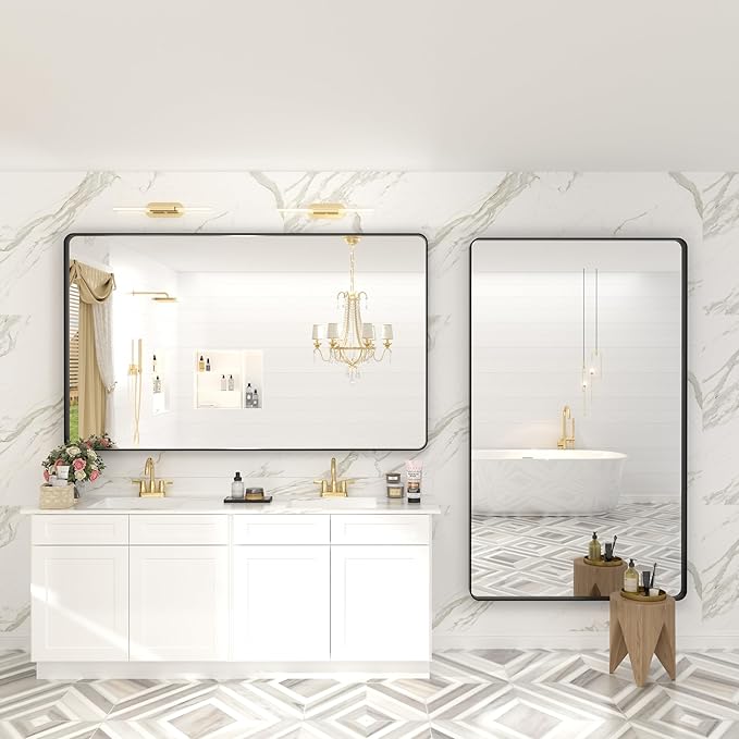 60x36 Matte Black Bathroom Mirror, Modern Rectangle Metal Framed Mirrors for Wall, Rounded Corners, Shatter-Proof (Horizontal/Vertical)