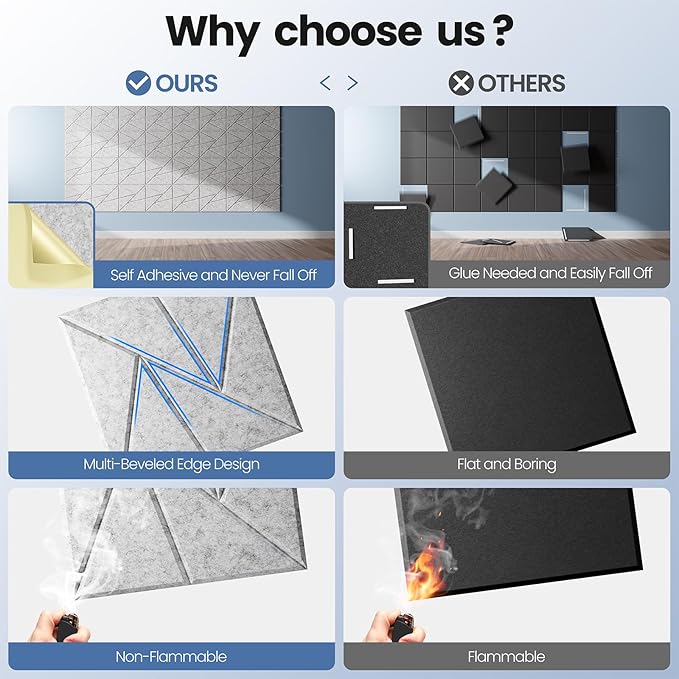 - ♻️【Eco-friendly and Materials Safety】Made of 100% polyester fiber,they are no smell and B1 class flame retardant.No any risk when you stay in a room with our acoustic foam panels for a long time.
