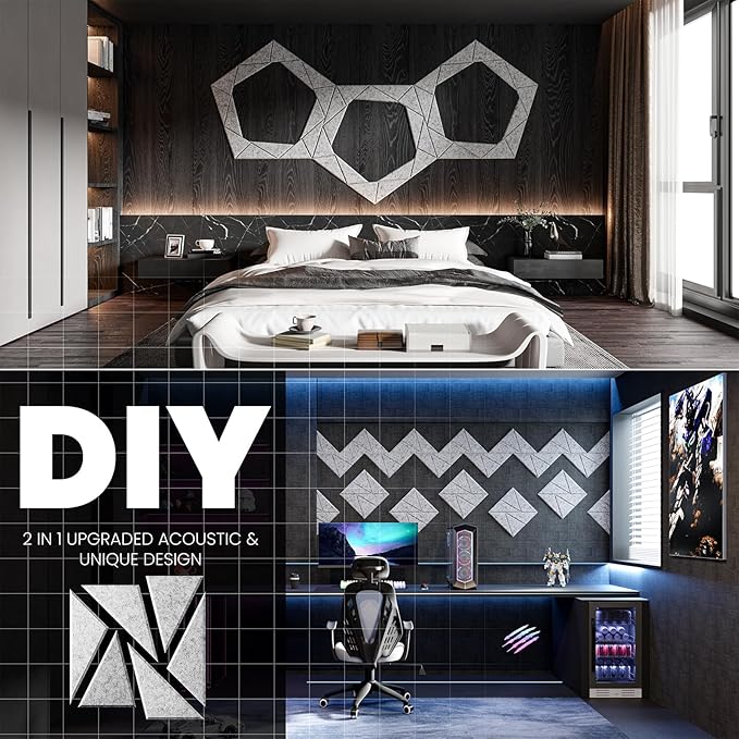 - 👍【Perfect for wall decoration】Be different from other acoustic panels,We have not only upgraded their acoustic performance,but aslo their appearance.Adopt beveled edge and multi-line design.They can be DIY into pinwheel patterns and multi-ring patterns.They absorb unnecessary sound while playing a good role in decorating the wall.Perfect for professional studios, video blogger,game room, podcasting, school,home theaters,offices,etc.