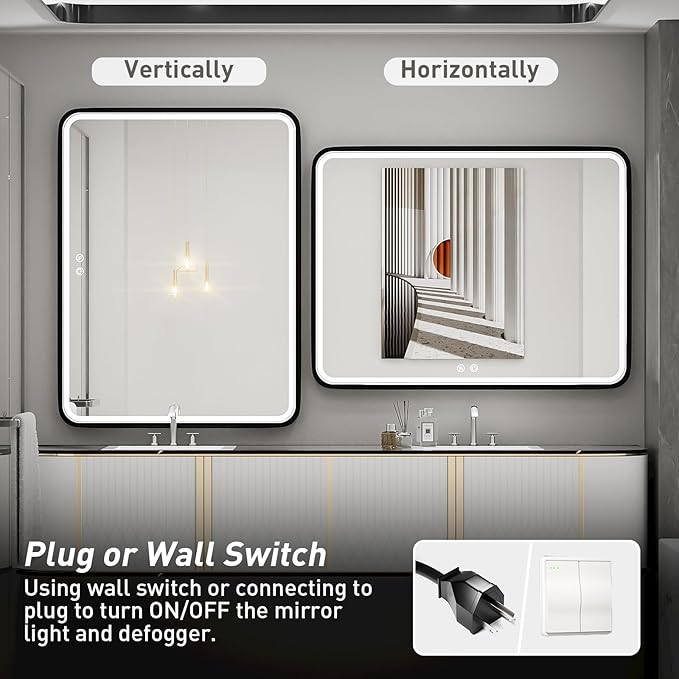 - 【 Easy Installation】Lighted Mirror can be directly plugged into a normal outlet or hardwired to a wall switch,You can use a wall switch or the touch button to turn the light ON/OFF