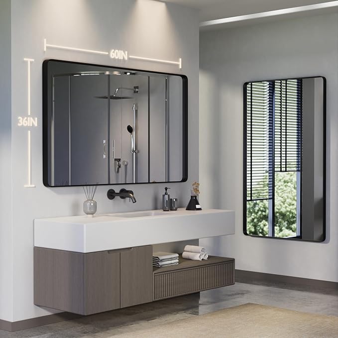Large Bathroom Mirror for Wall, 60x36 Inch Matte Black Framed Bathroom Vanity Mirror for Farmhouse Living Room Bedroom, Anti-Rust, Tempered Glass, Rounded Corner, Horizontal/Vertical