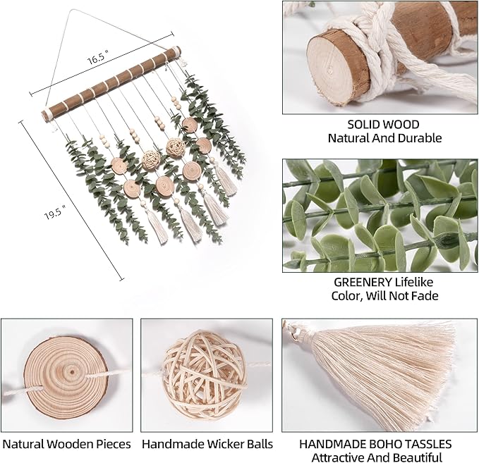 - 【Purely Handmade, Value for the money】 This eucalyptus wall hanging is pure handmade. Each detail, including the eucalyptus stems, wood slices, beads, and tassels is purely hand-tied to the branches. As a result, each piece may vary slightly in shape and size.